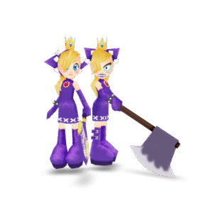 This model showcases a pair of adorable twin princesses, each with unique expressions. One princess holds a yellow and white patterned object, possibly a shield or fan, while the other wields a large axe. Both characters are dressed in matching purple outfits, complete with golden crowns adorned with jewels and purple boots. Their attire includes purple dresses and gloves. The overall style is reminiscent of a cartoon character design, with simple yet expressive features. The model is low-poly, resulting in a small file size and efficient rendering.